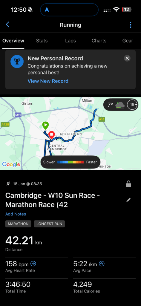I decided that on 18th January 2026, I’d run a marathon on my own, in Cambridge, with no music. And to make it even spicier, I’d try to do it by running the same half marathon route twice. I was intrigued by the impact of boredom (no music, same stretches of road multiple times, including up Castle Hill four times … ), plus the experience of running the final 10km (I’d run 30km multiple times, but never quite gone all the way to 42km).